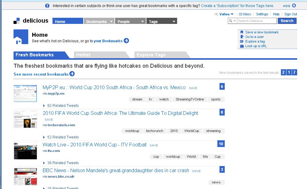 I can remember how ridiculously excited I was when I first discovered Delicious (a bit sad but there you go!) Delicious is a bookmarking service. Â Traditionally you have probably used the ‘save bookmark’ feature on your browser in order to save websites. This website enables you to do that but also to tag websites with key words (so you can easily find them again) and find other people’s tagged websites too. If you use the search bar on Delicious it is like a really intelligent version of Google – it will throw up websites that people have deliberately tagged with your search term, rather than sites that just contain that word (which is what Google does). It’s just a great place to keep all your favourite bookmarks, share them with other people and find new sites by looking at other people’s bookmarks. A social form of Google really. the great thing about it is that your bookmarks live on the Delicious website rather than on the PC you’re working on, so you can access them anywhere. You can look at my bookmarks here: http://delicious.com/vahva