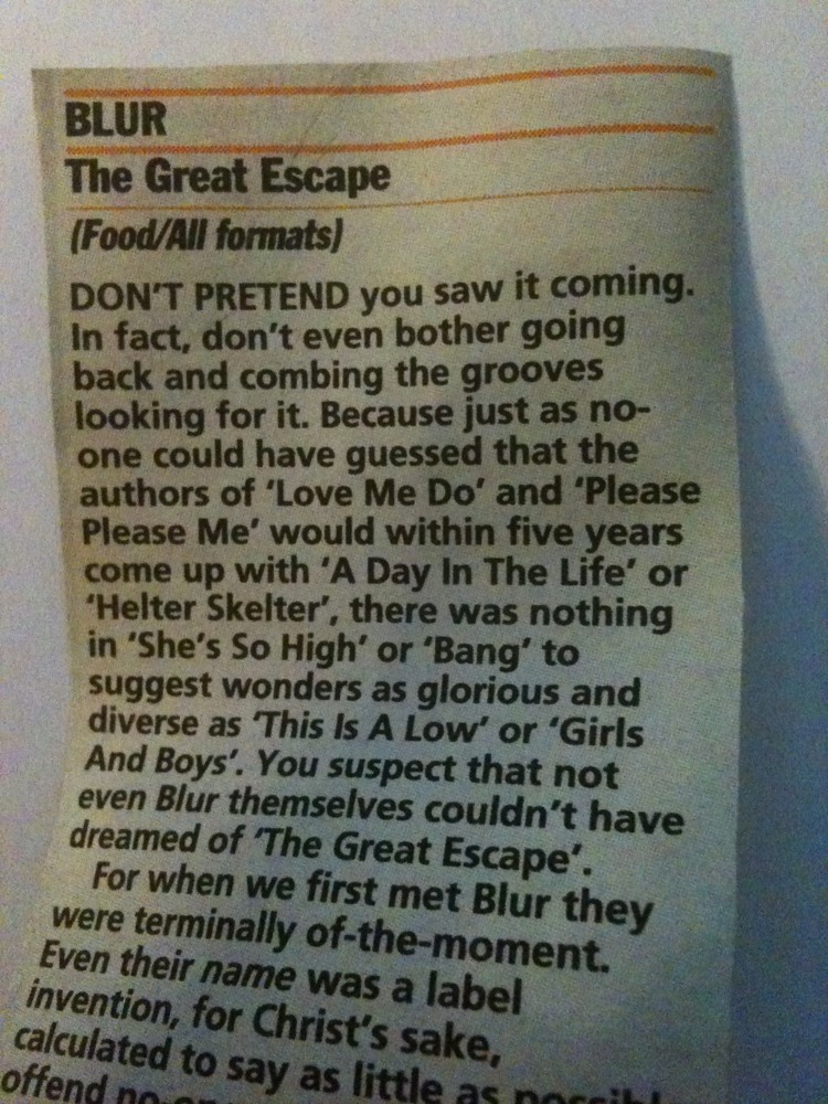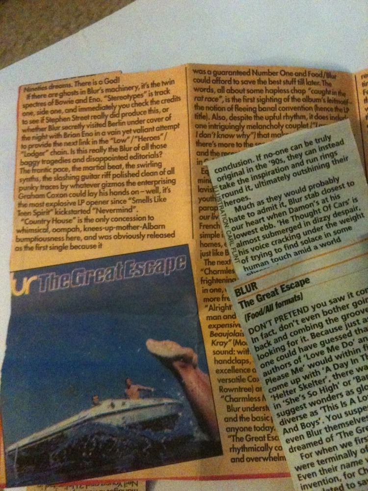 I think I kept these inside the cassette of the album. One is by Johnny Cigarettes where he gives it 9/10. The other doesn’t have the journalist’s name on the cutting which is probably a good thing for them as it says it’s better than Parklife!