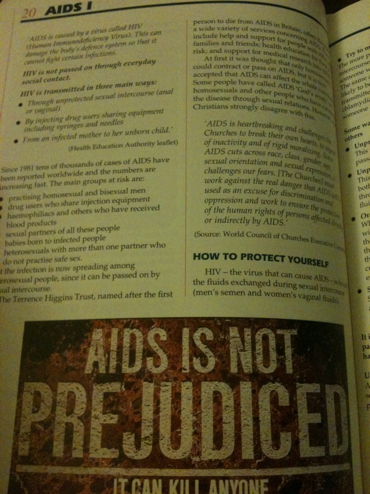 As part of my GCSE RE course we did Contemporary Moral Issues. Finding this text book has made me realise how progressive my Catholic school was (St Bernard’s, Westcliff) & how well taught we were about moral issues. See these pages about Aids. I wonder if this book is still being used. It’s actually very good and very balanced.