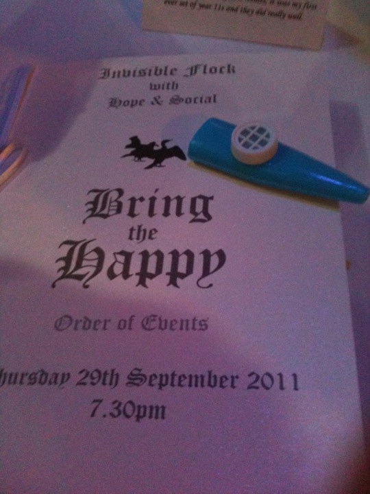 Last night I had the privilege to attend the Bring the Happy performance by a group of artists called Invisible Flock supported by the band Hope & Social.