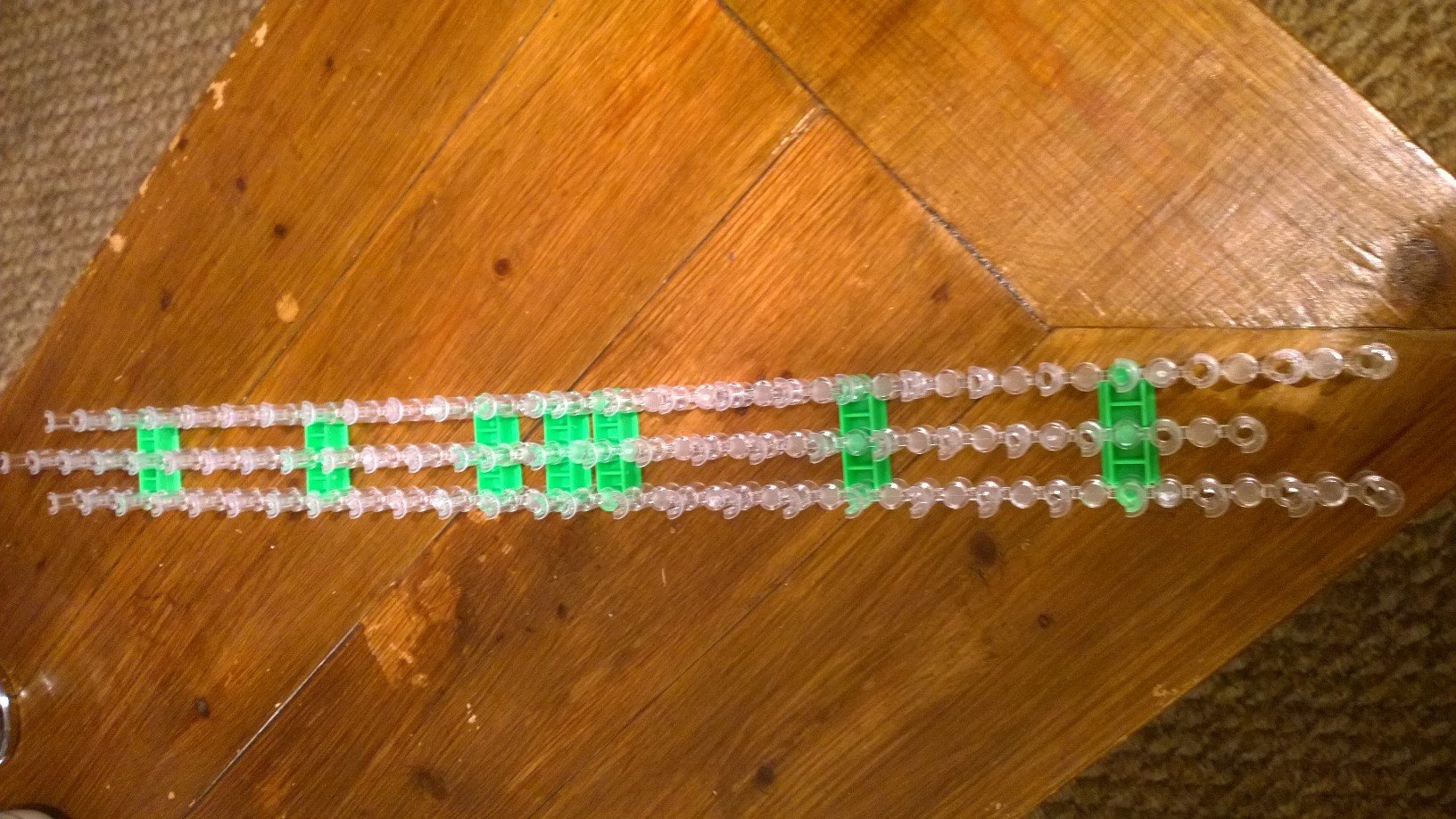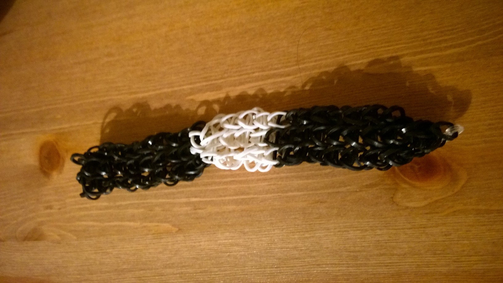 Then I followed the instructions in this YouTube video simply using black bands up to the middle of the long loom (for 10 pegs) and then white for about five pegs, then black for the rest. This meant it was quite fiddly as because they were all the same colour it was quite hard to see if I’d hooked the correct band – it took 3 goes before I managed it properly.