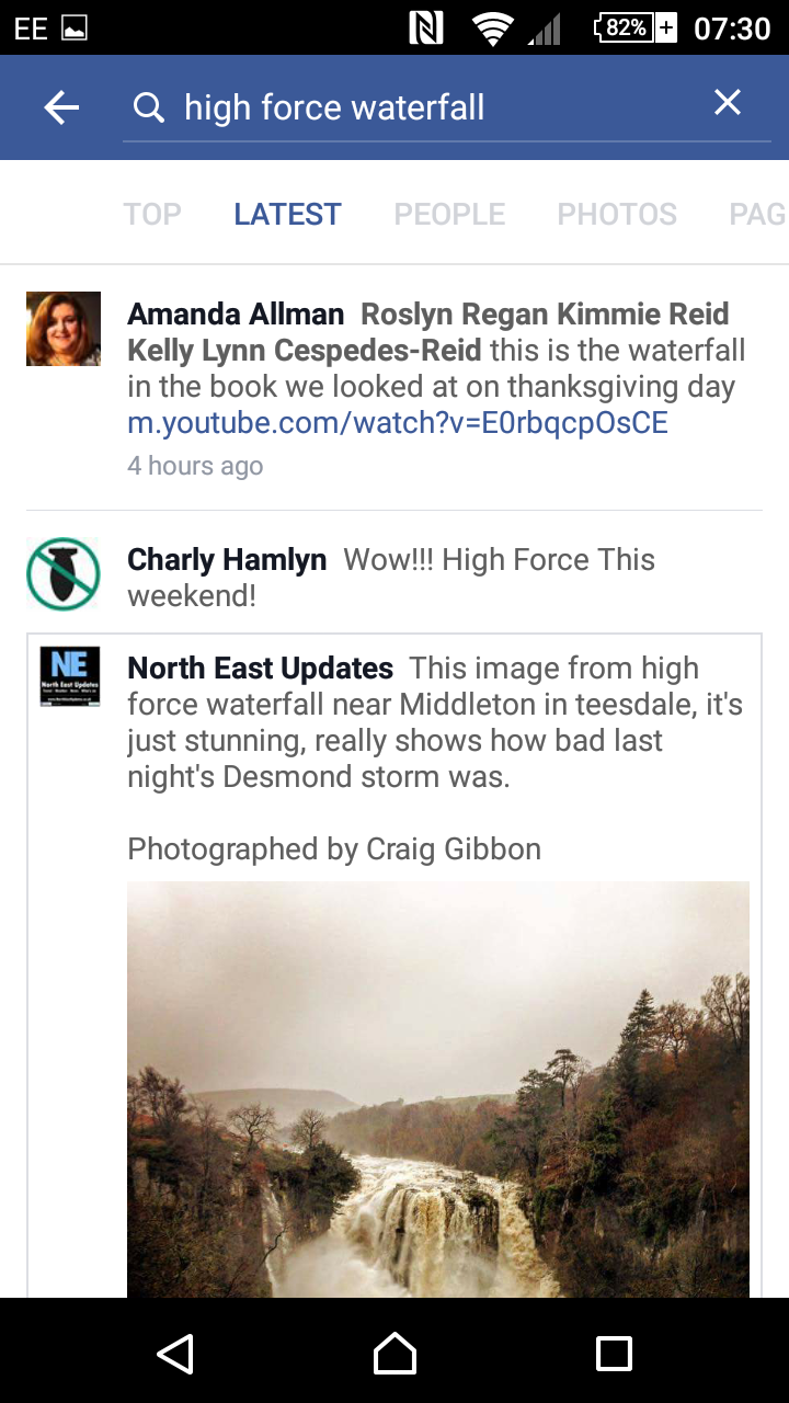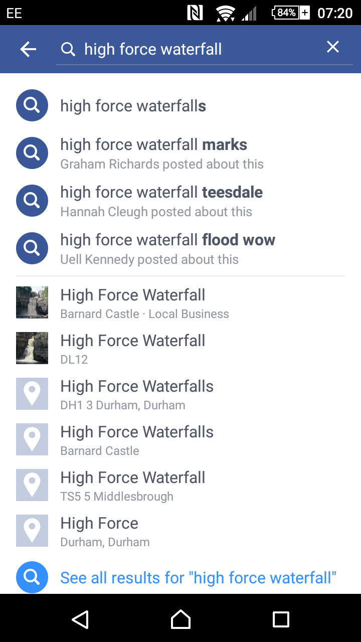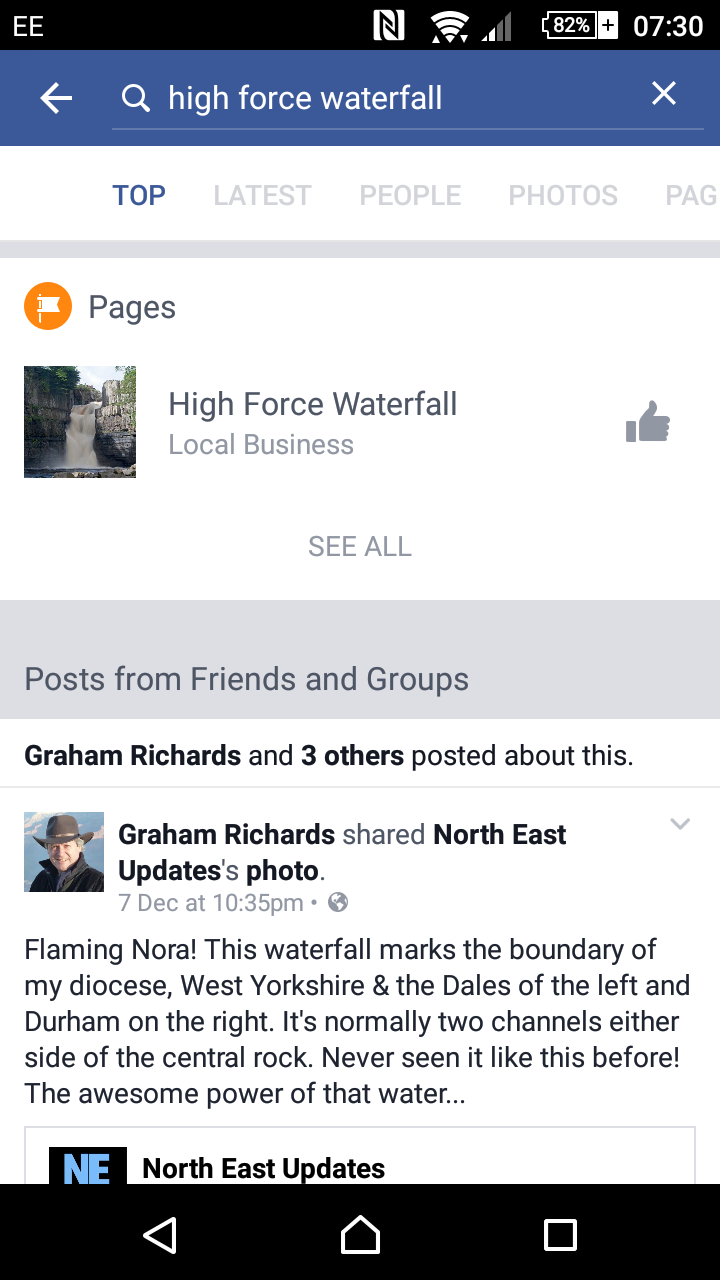 On the Android Facebook app (and I’m assuming the Apple version too) the search function is a lot better than it used to be. I discovered this almost by accident searching for a picture I knew I’d seen on Facebook of High Force Waterfall. Now, when you search the top results show if a friend of yours shared something on that topic: